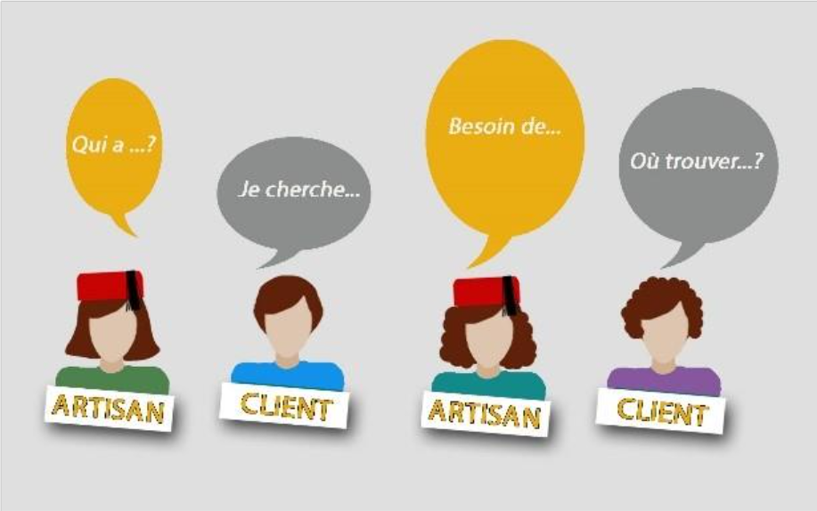 Le client crée un compte "Client" et fait son shopping parmi les artisans présents sur la plateforme. Il contacte directement l'artisan via sa fiche pour poser ses questions ou passer commande.