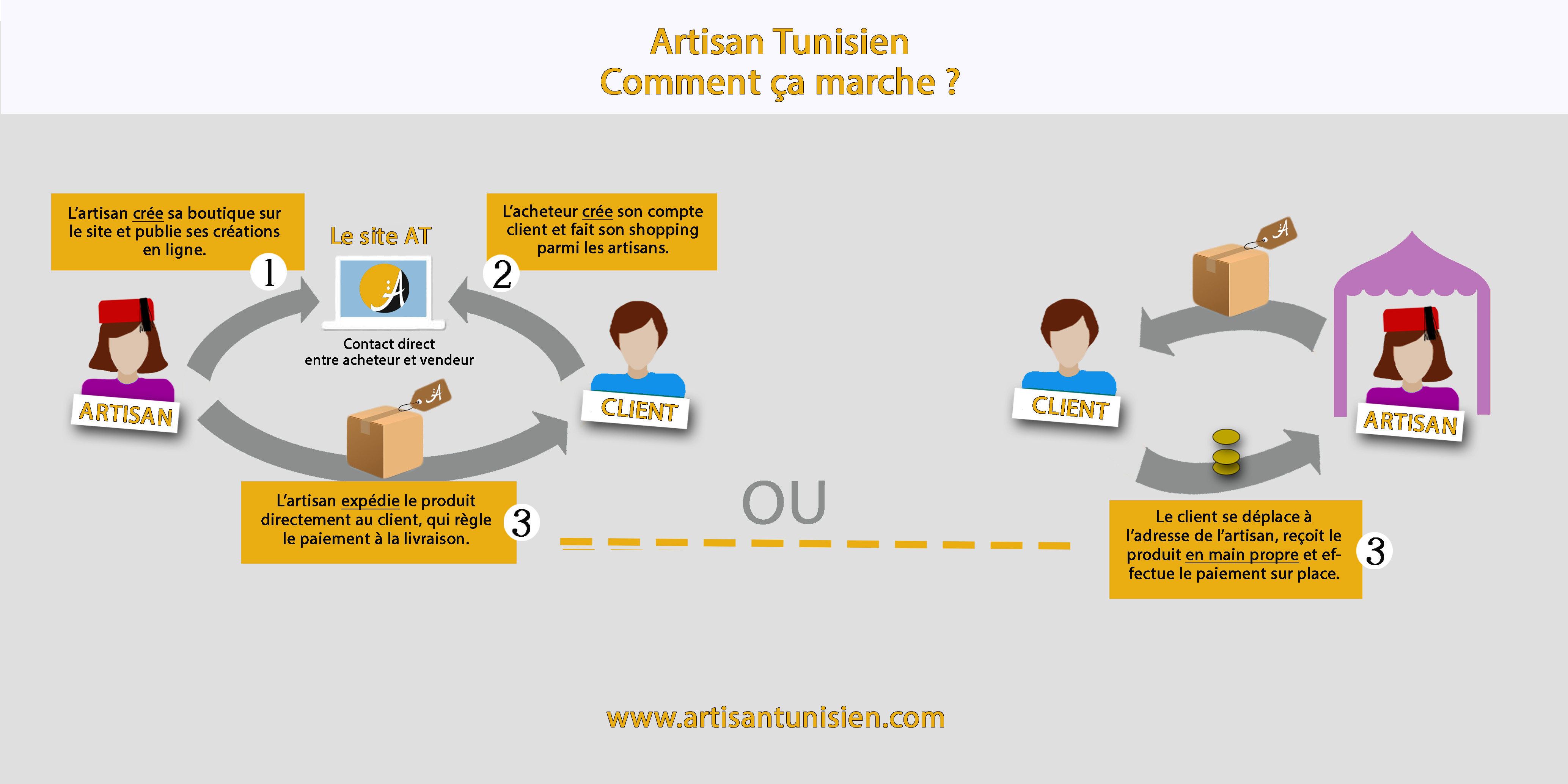 Le site Artisan Tunisien (AT) est un annuaire interactif qui met en relation directe les artisans et les clients. Il ne prend aucune commission, ne gère pas les paiements ni les livraisons. Il agit uniquement comme intermédiaire entre acheteur et vendeur.