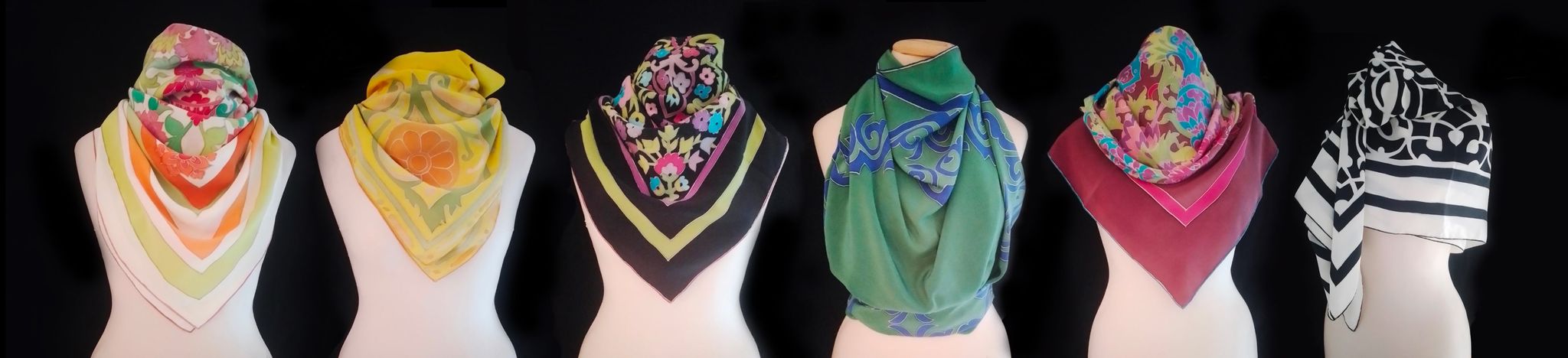Foulards, châles, écharpes, étoles, jebbas, caftans, kimonos,… en satin de soie ou étamine de laine, faits main, pièces uniques aux couleurs vibrantes et aux formes audacieuses.