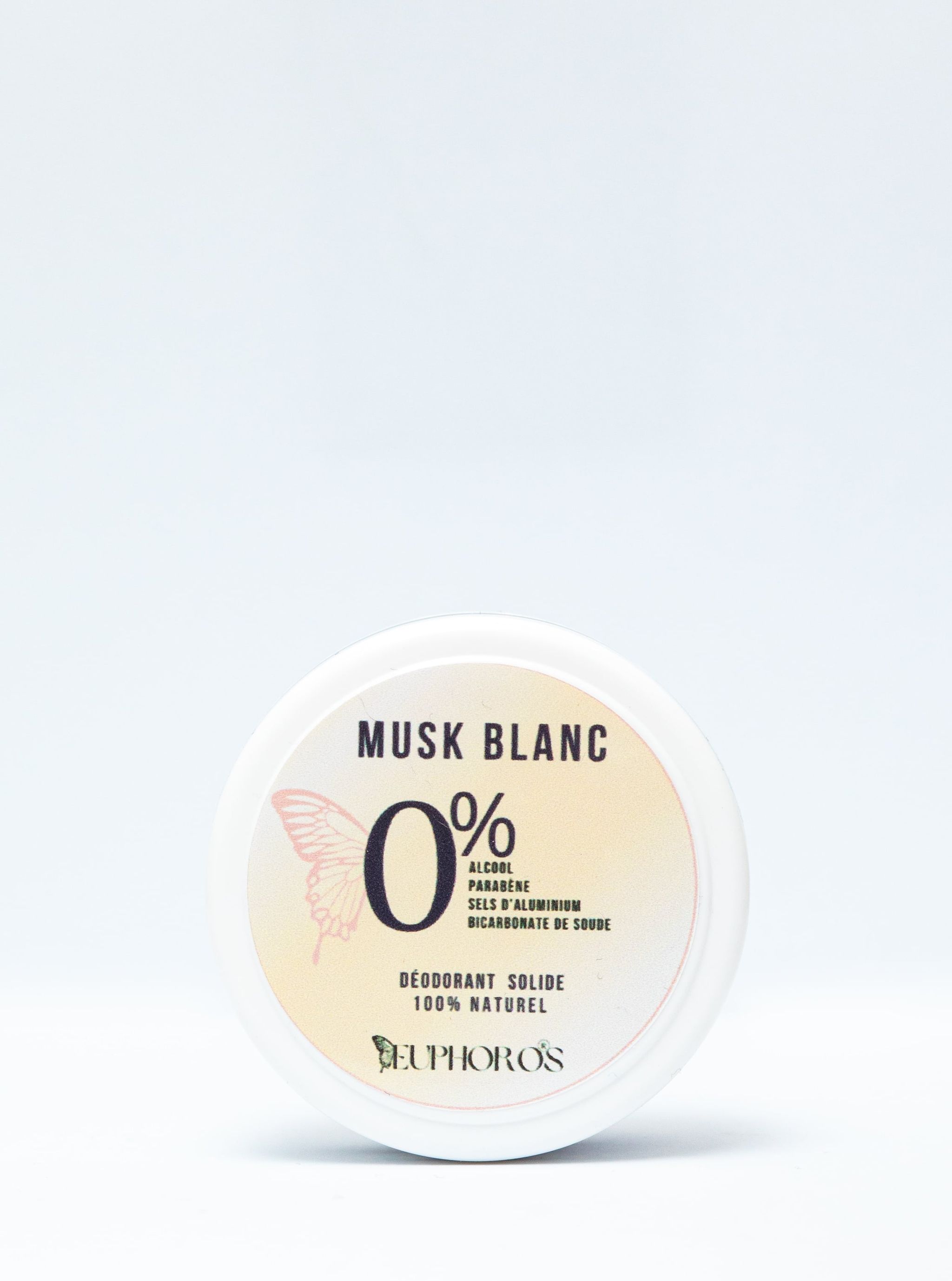 Baume déodorant naturel au musc blanc. Protège efficacement contre les odeurs, hydrate et respecte la peau, avec une texture fondante facile à appliquer.