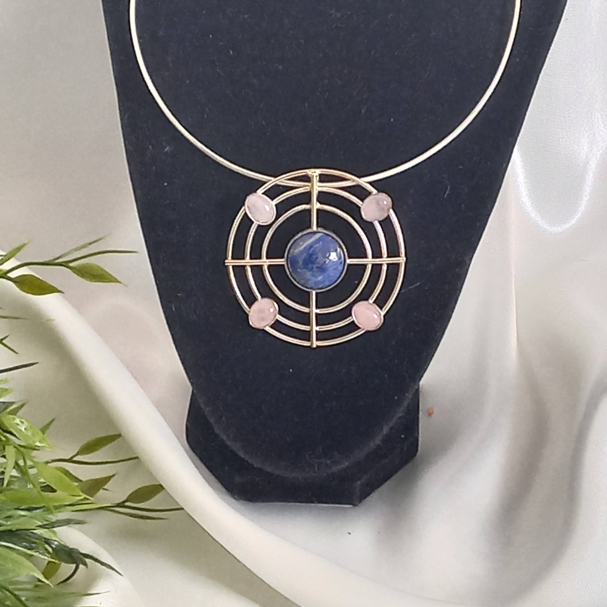 collier en laiton argenté et pierres gemmes: lapis lazuli et quartz rose