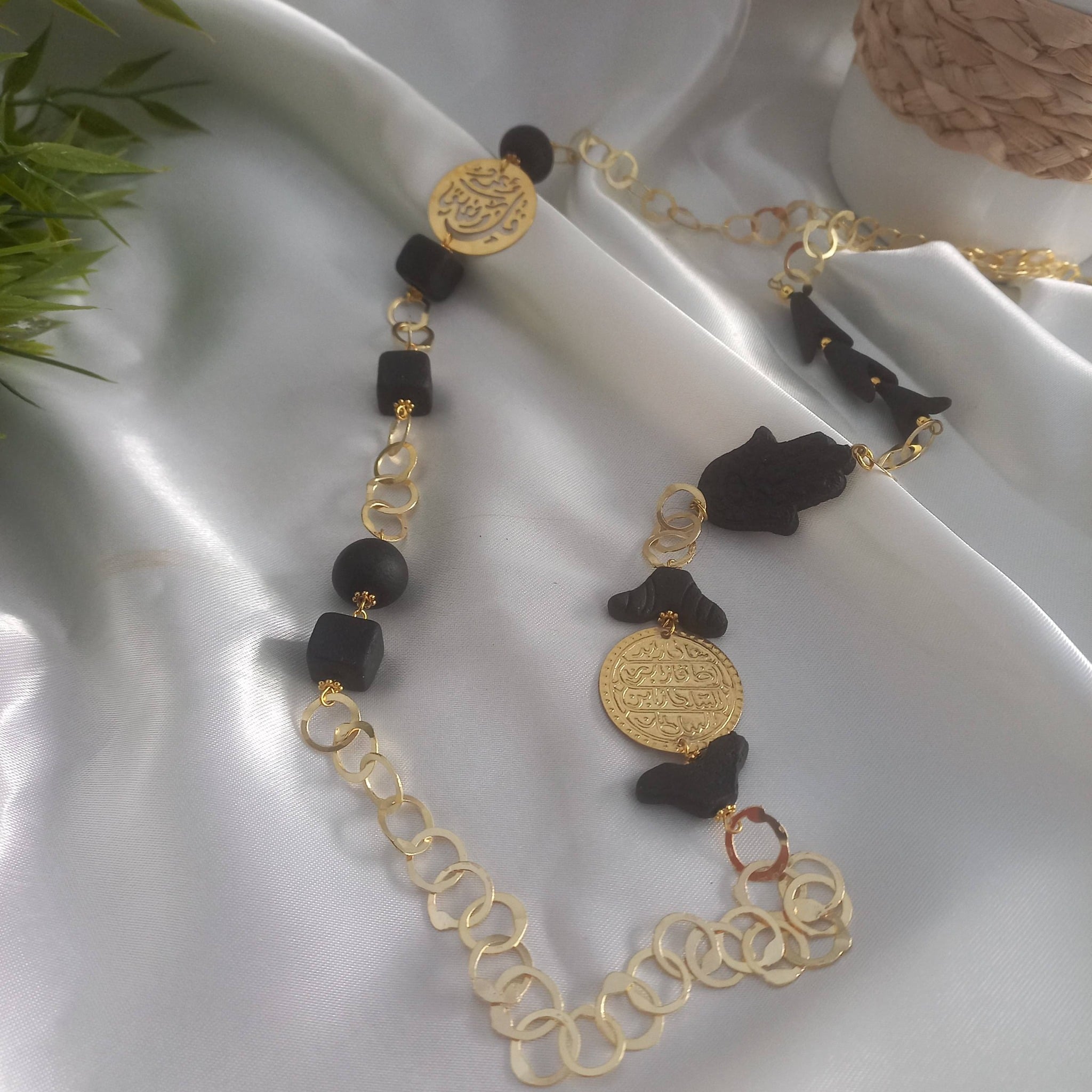 sautoir en laiton doré des fétiches en laiton et ambar fait main