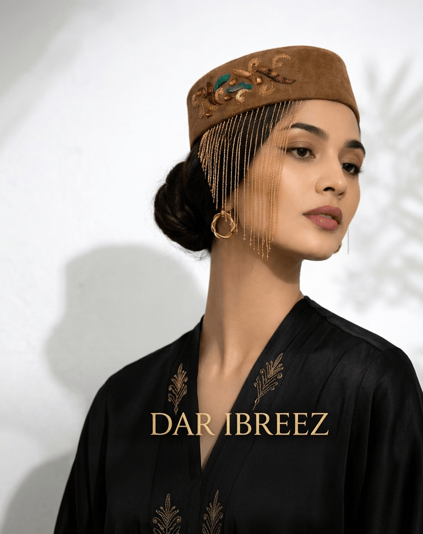 Affirmez votre style avec la toque "chachia " Ambre, une pièce de caractère qui capture l'essence du luxe authentique. Sa texture veloutée brun chocolat, rehaussée d'une broderie artisanale aux nuances de cuivre et d'émeraude, en fait l'accessoire ultime pour celles qui osent la distinction. Le regard est immédiatement captivé par sa frange de chaînes dorées ultra-fines, créant un voile de lumière mystérieux à chaque mouvement.