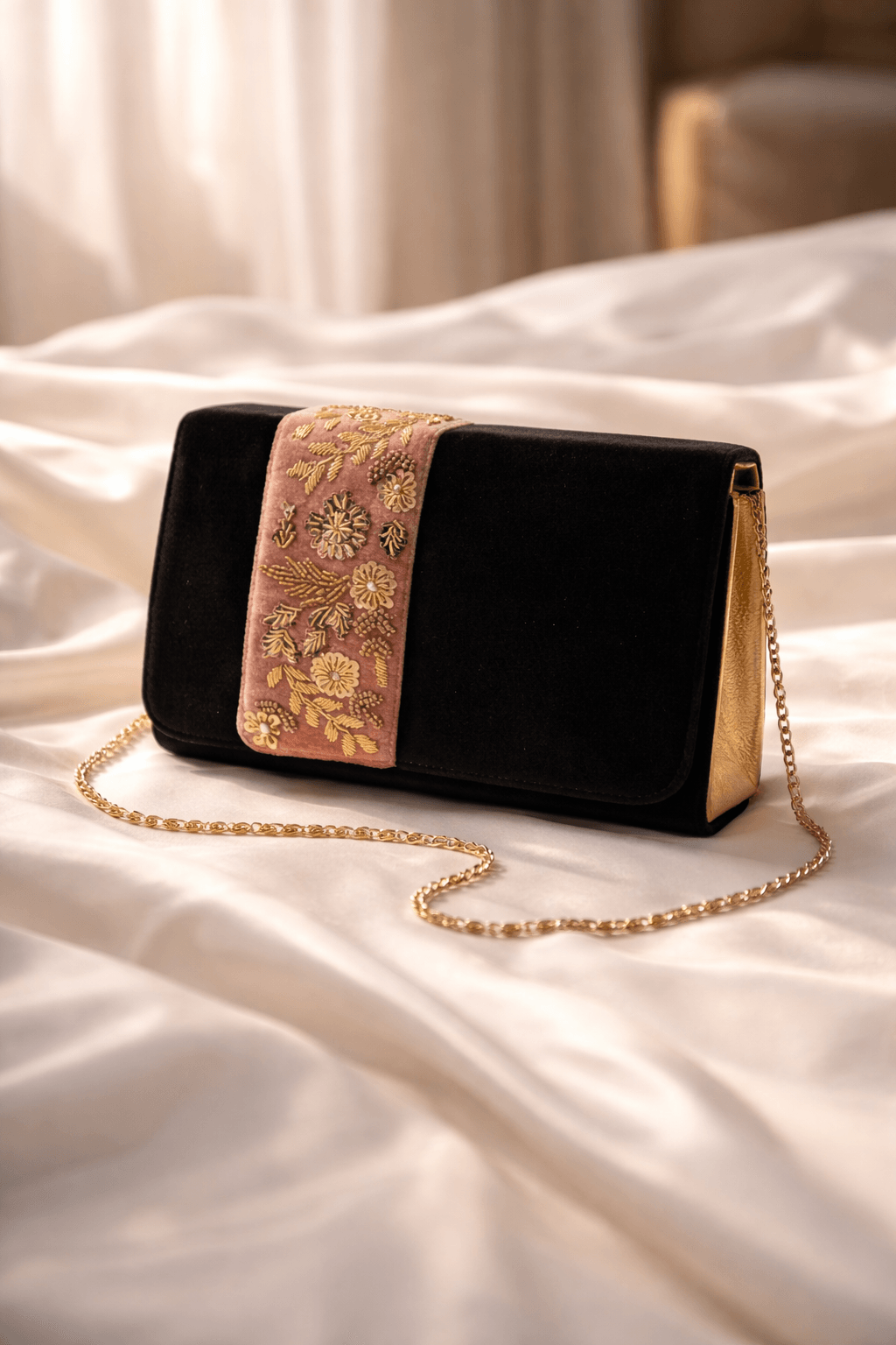 Réalisée avec patience et précision, cette création marie un velours noir profond à une bande en rose poudré délicatement brodée de motifs floraux dorés.