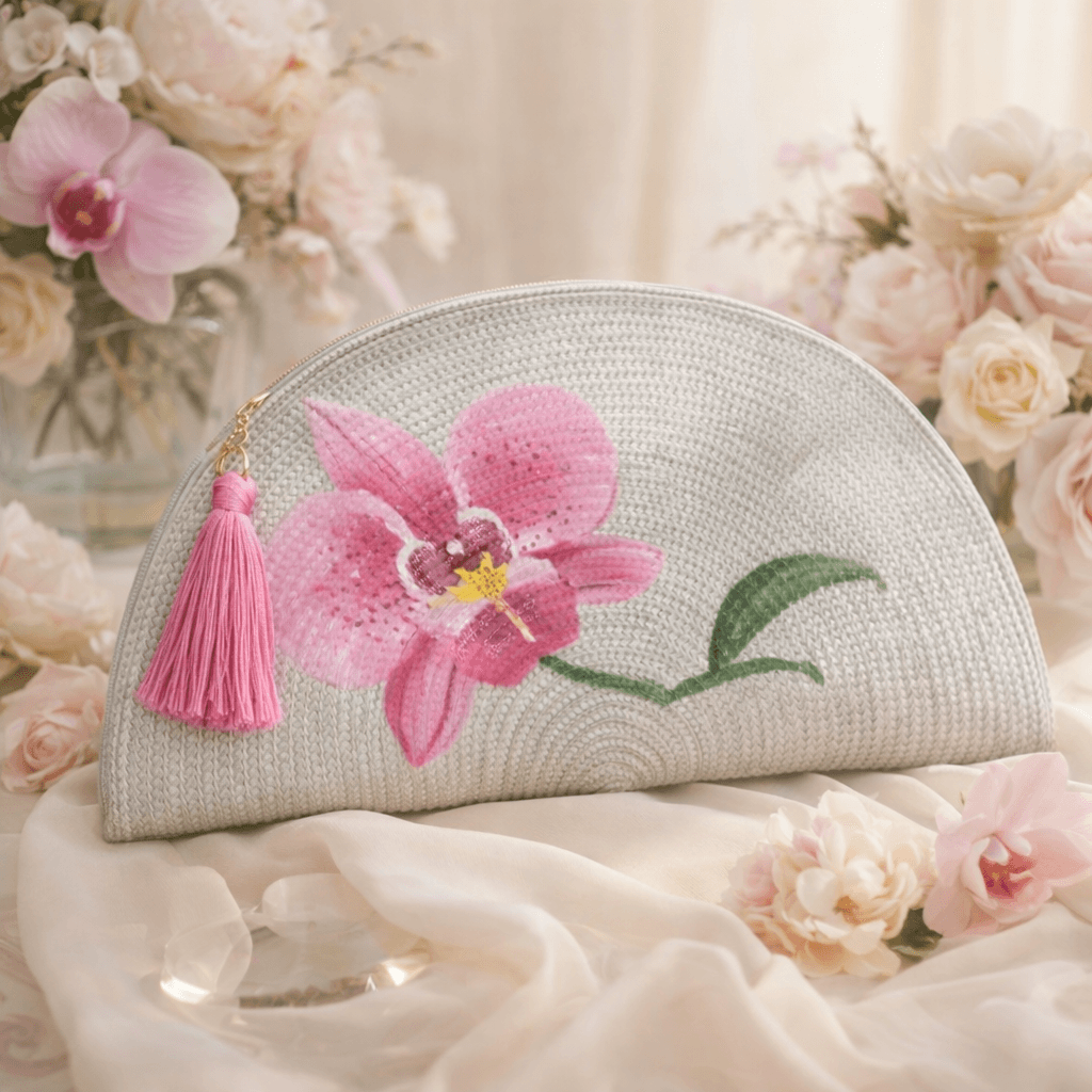 Pochette élégante en forme demi-lune, tressée en Gris, ornée d’une magnifique orchidée rose peinte à la main avec des détails délicats et lumineux. Son pompon rose raffiné ajoute une touche chic et féminine. Une création artisanale unique, alliant charme, élégance et authenticité, parfaite pour sublimer vos tenues d’été, soirées et occasions spéciales.