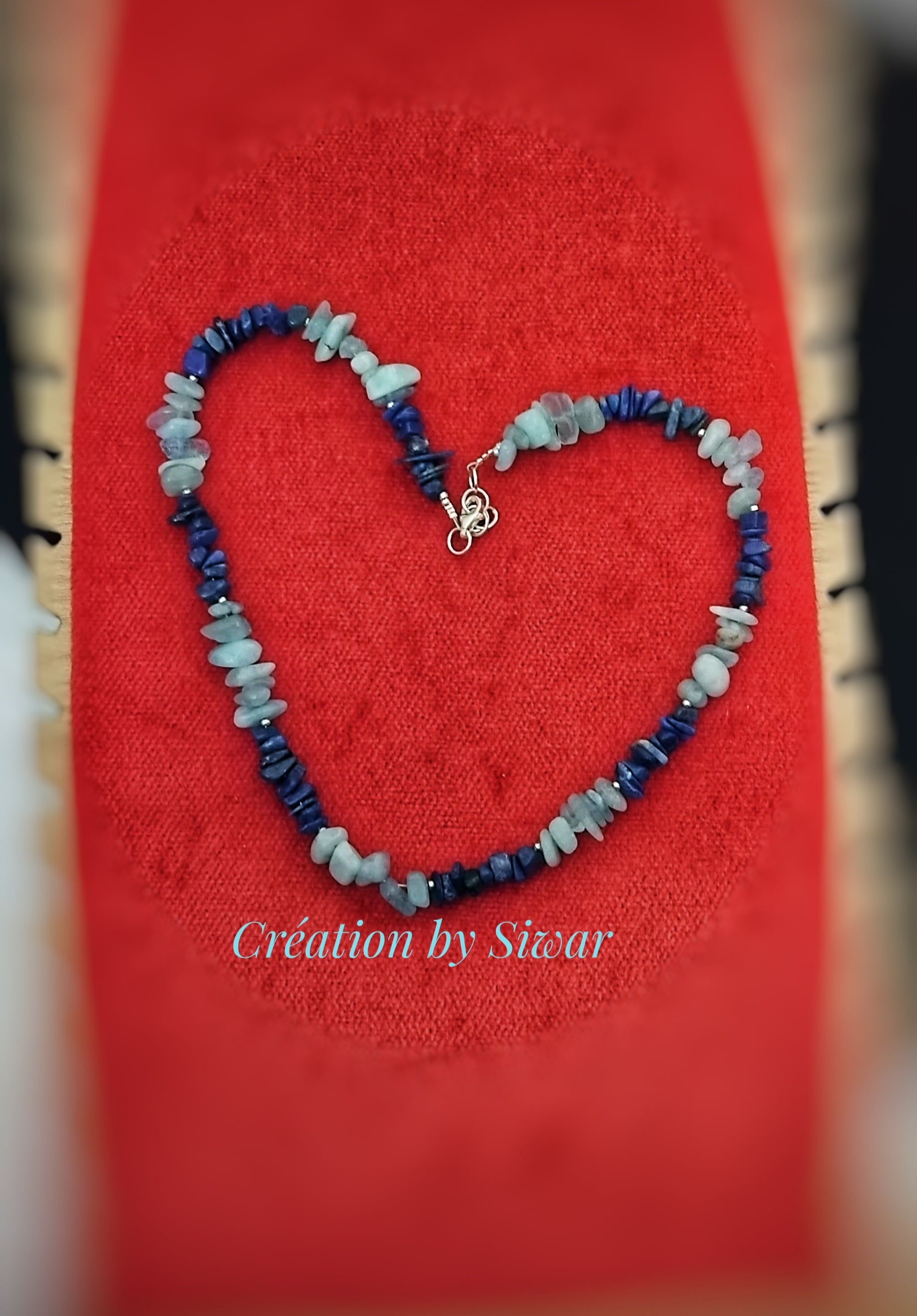 Collier en Lapi lazuli et Aquamarine, fermoir et anneaux en Argent