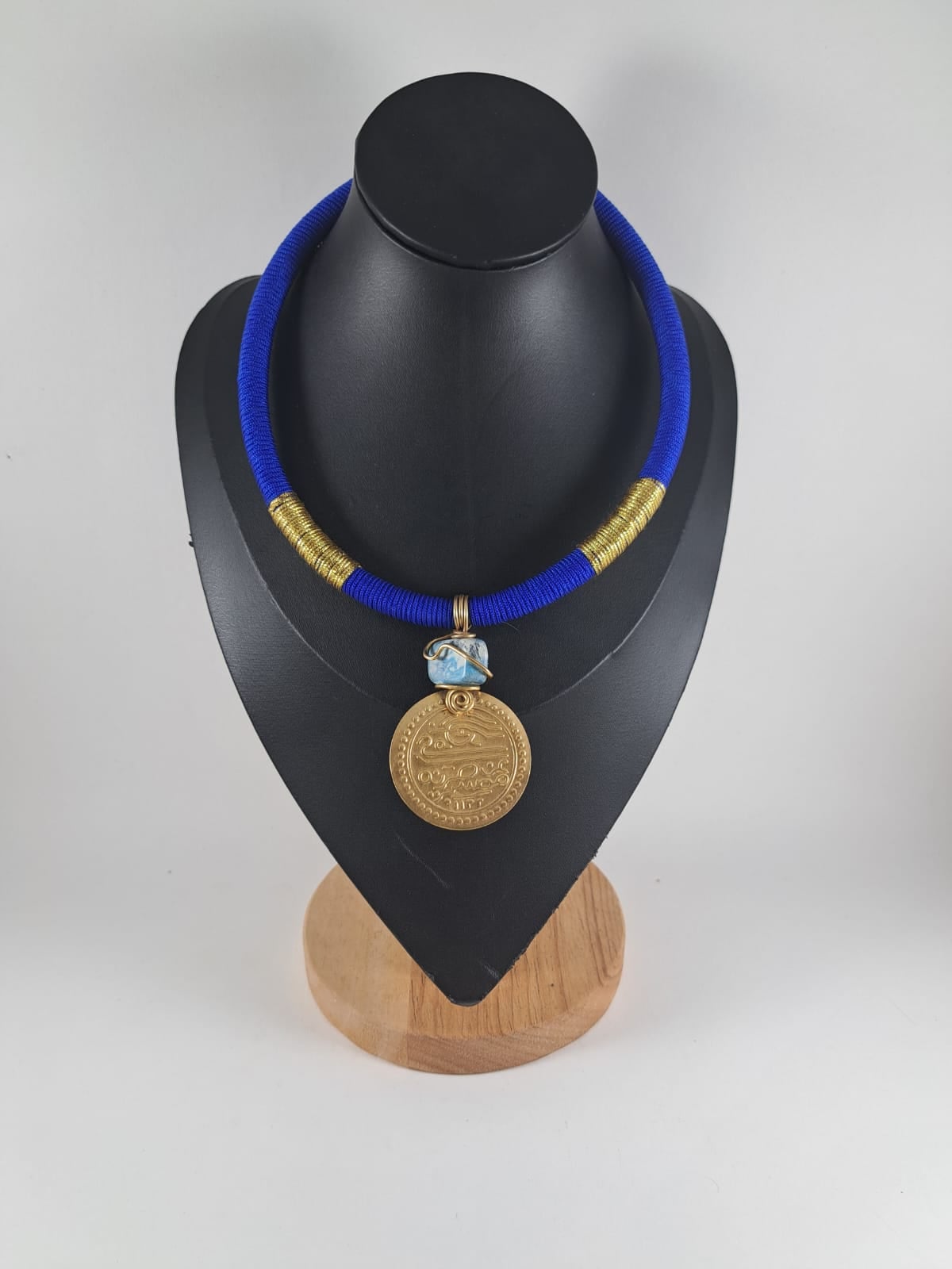 Collier en cordon bleu roi et pendentif mahboub en cuivre plaqué or