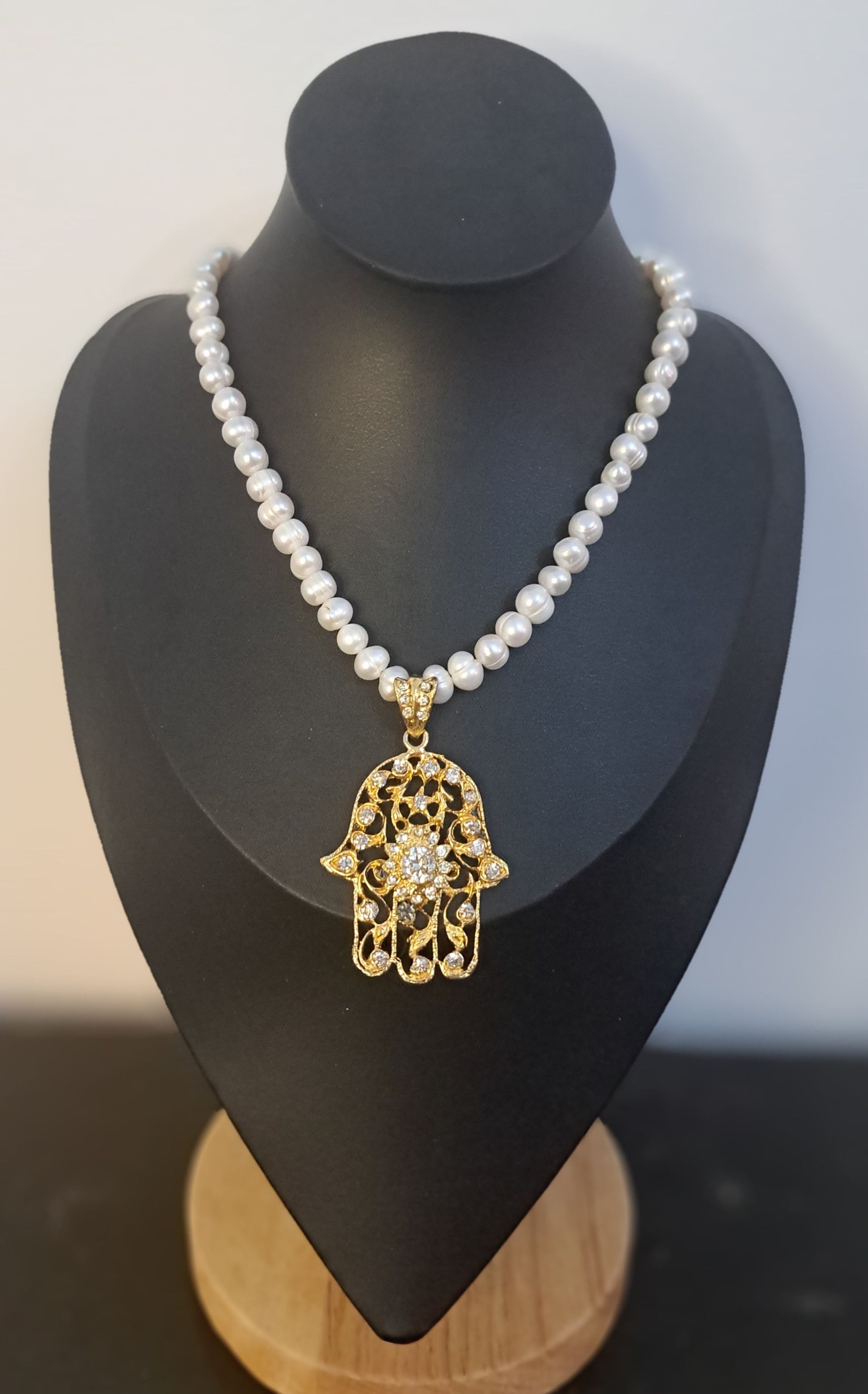 Collier en perles de culture pendentif khomsa plaqué or incrusté de cristaux - Fleur de sel accessoires | Artisan Tunisien