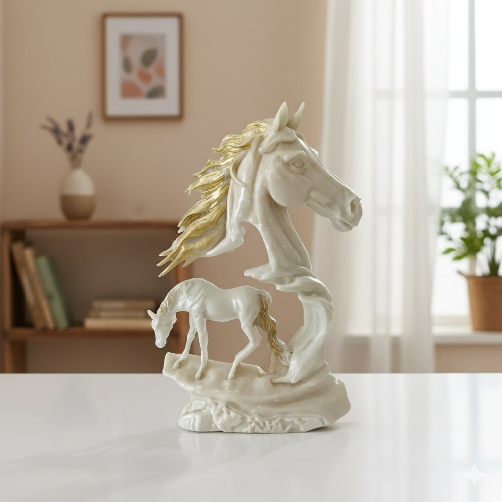 Design Unique : Un jeu de formes entre une tête de cheval majestueuse et une figurine en mouvement, sublimée par des détails dorés à la main.