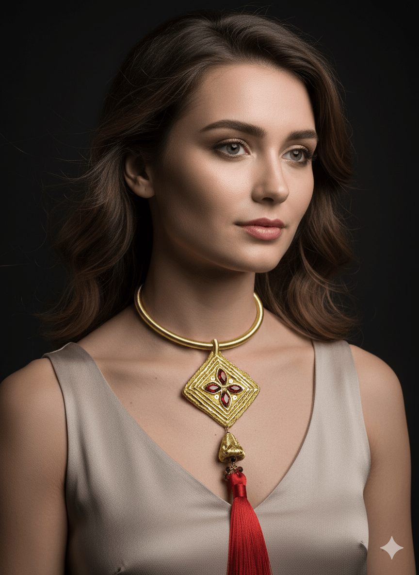 Collier rouge brodé à la mehdoise orné de cristaux et monté sur un cordon en fil d'or