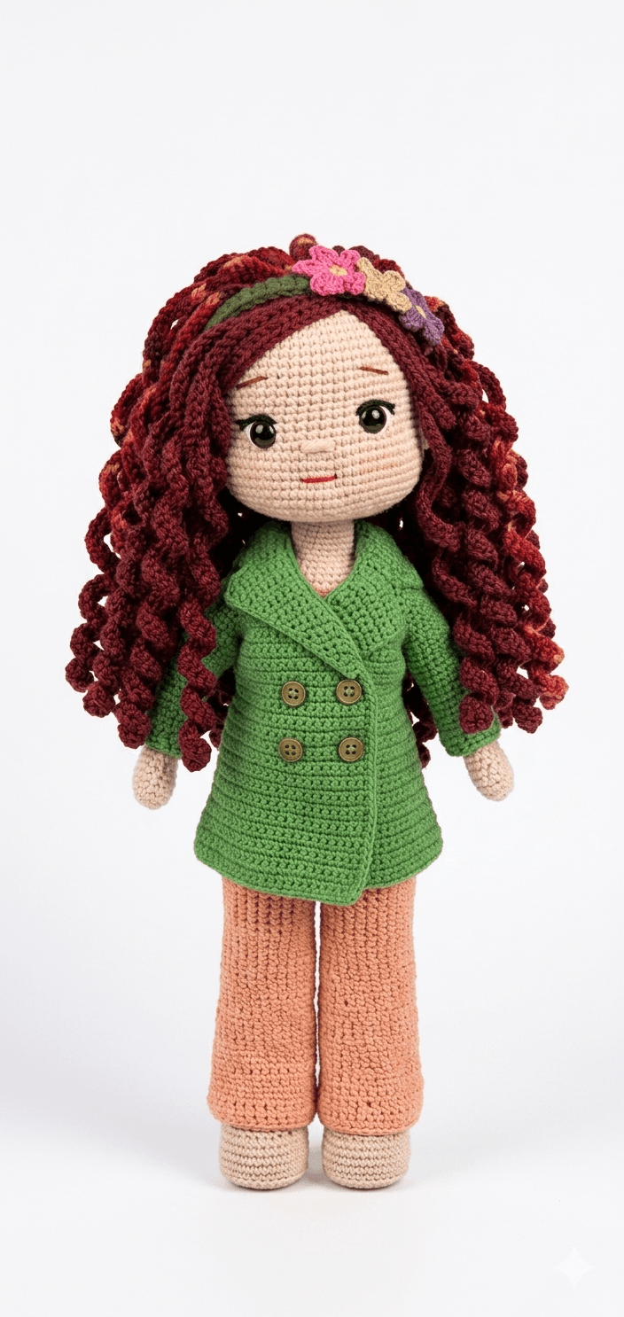 Laissez-vous séduire par Kenza, une poupée artisanale au style affirmé et au caractère unique. Avec sa magnifique chevelure bouclée d'un rouge profond et son manteau vert forêt soigneusement boutonné, elle incarne un mélange parfait de douceur et de modernité.