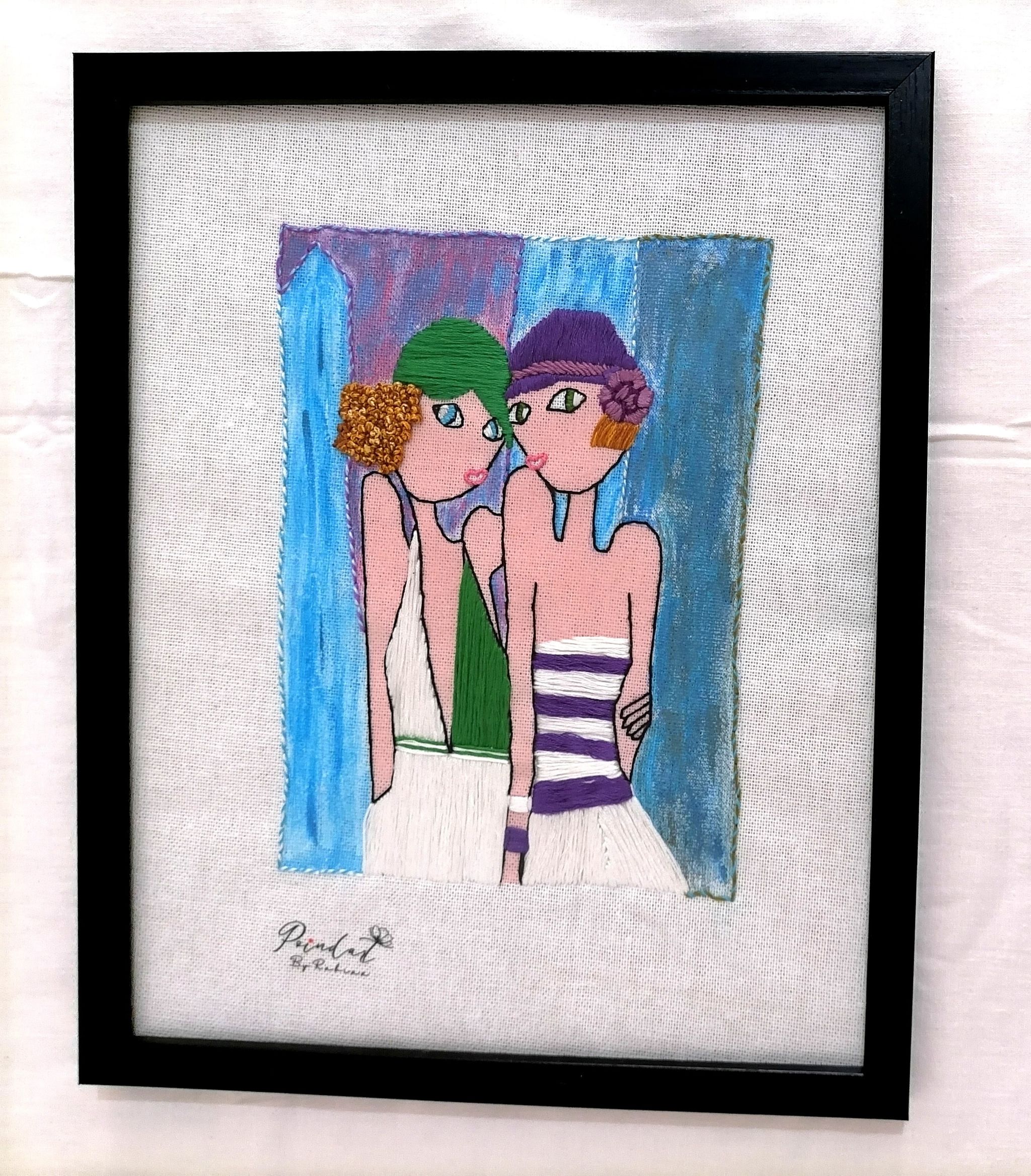 Ce tableau brodé à la main représente deux amies, liées par une tendresse et une complicité évidentes. L'une d'elles, avec un caractère protecteur, entoure son amie de son bras, comme pour la rassurer et la protéger du monde extérieur. Les deux jeunes femmes partagent un style similaire, avec des robes qui se complètent, et des chapeaux qui font écho aux couleurs de leurs tenues.