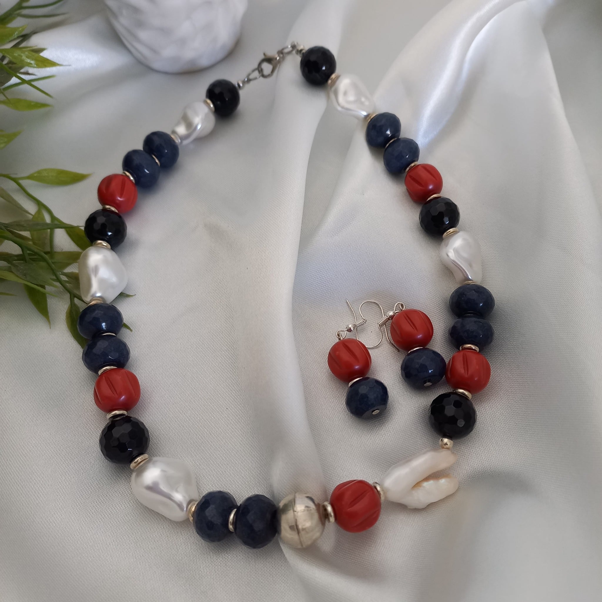collier et boucles d'oreilles en pierres naturelles ,nacre et laiton
