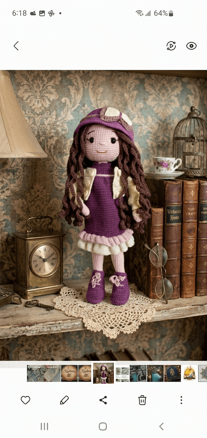 Rencontrez Rosaline, une adorable poupée au crochet imprégnée d’une douce nostalgie. Avec son style délicieusement rétro, ses boucles brunes caractéristiques et son ensemble harmonieux aux tons pourpres et crème, elle semble tout droit sortie d'une autre époque.