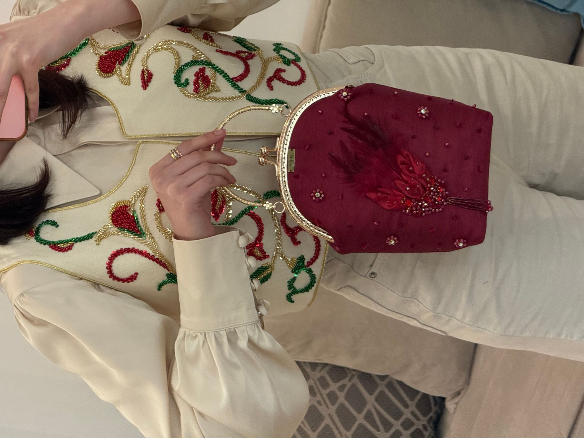 Sac de soirée brodé à la main, sublimé par des détails raffinés en plumes rouges et des cristaux ton sur ton, rehaussés de Swarovski rouges pour une touche d’éclat incomparable.
