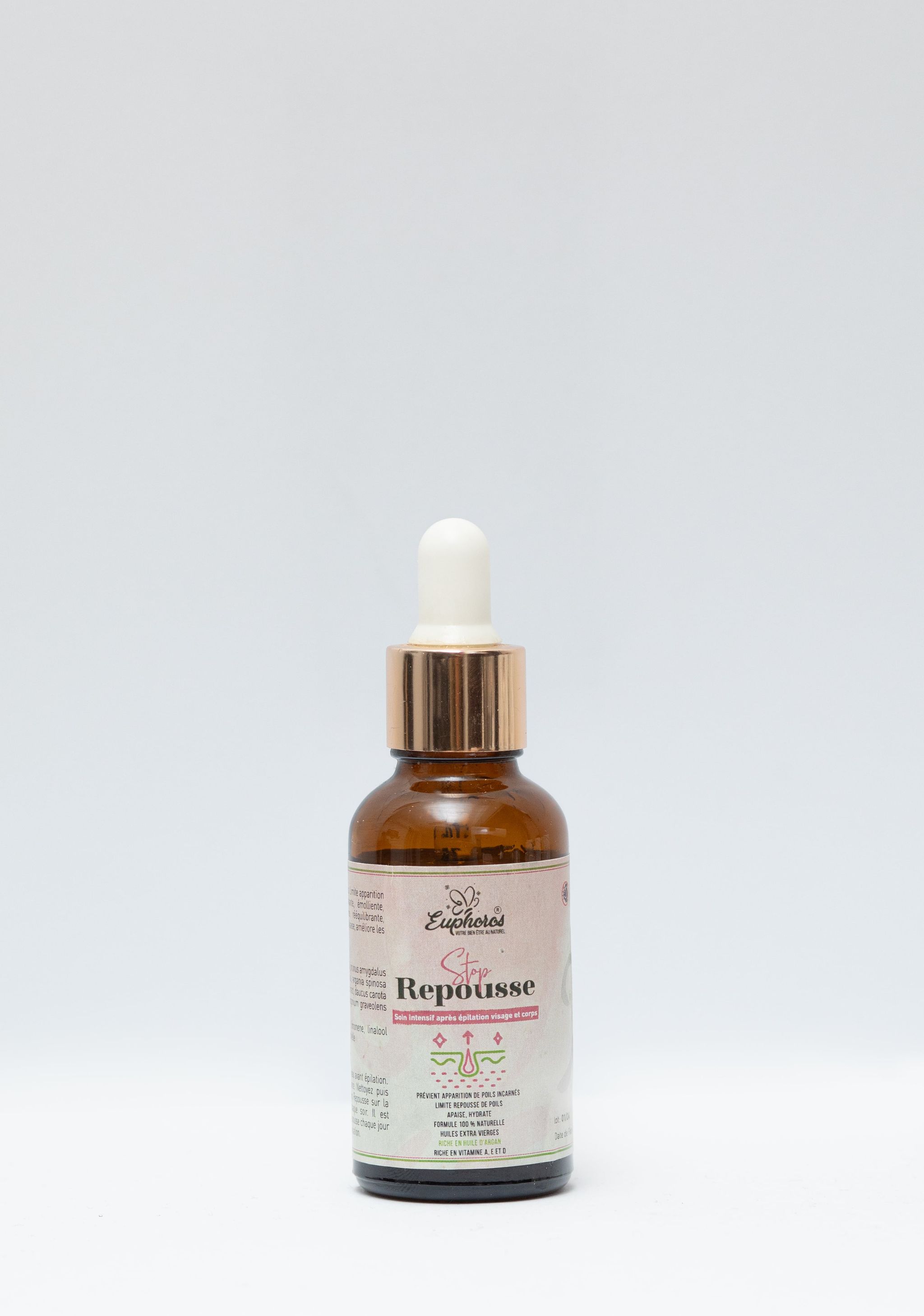 Gommer votre peau avant épilation. Épiler au sucre, à la cire ou à la pince. Nettoyer puis appliquer quelques gouttes d’huiles Stop repousse sur la zone épilée.